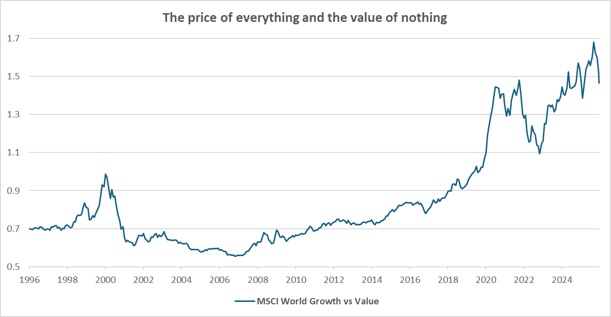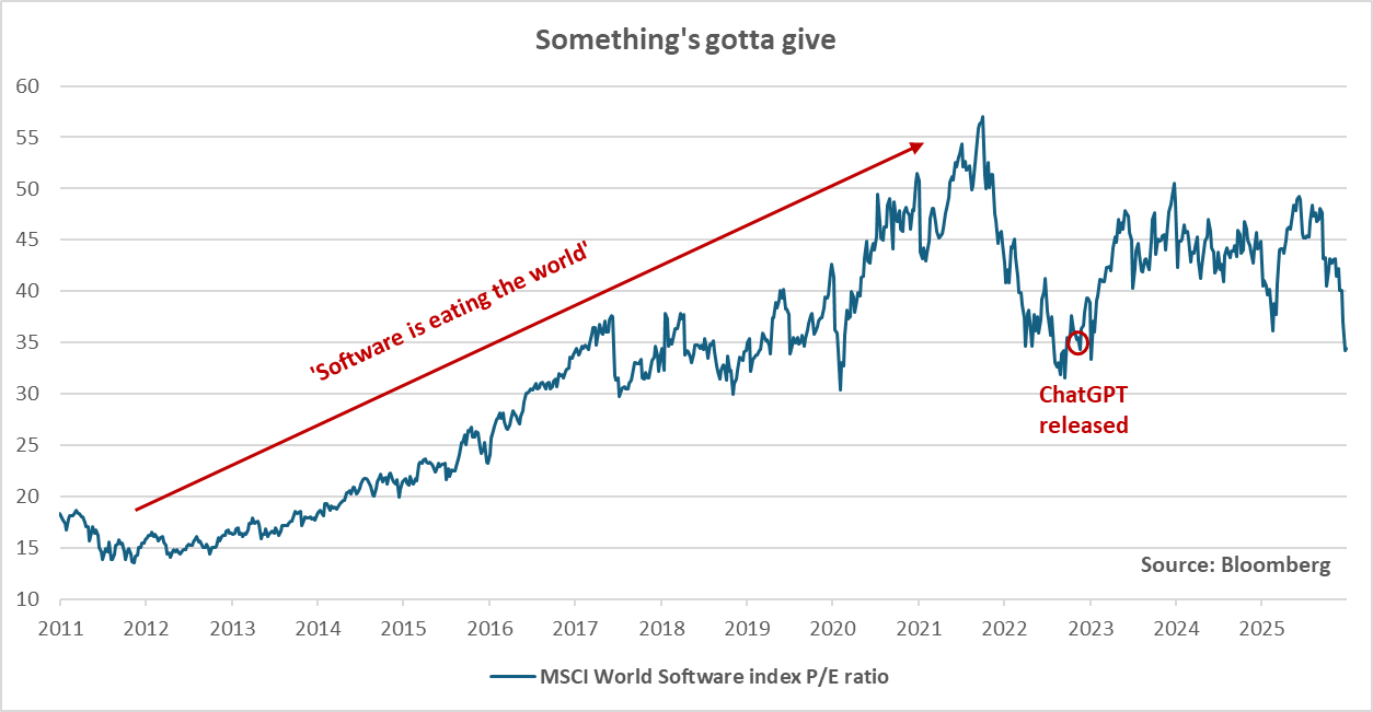 Investor beliefs: Maybe AI-enabled businesses will indeed disrupt many industries, or maybe all this fear is unjustified and we will adapt to technological disruption once again. Meanwhile, prices can move by a lot either way…