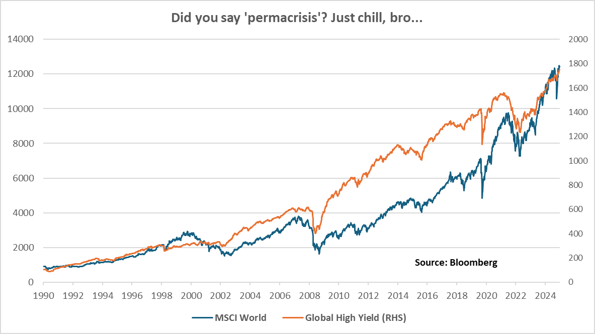While so-called fundamentals would recommend caution – at least as per their traditional definition, including such quaint notions as valuations, growth, inflation and interest rates – the price action says ”nothing to see here!” as risk assets keep marching higher.
