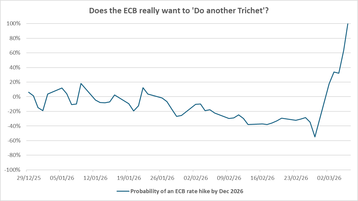 What stands out here is that European rates expectations have repriced higher, with an implied 100% probability of an ECB rate hike by December 2026.