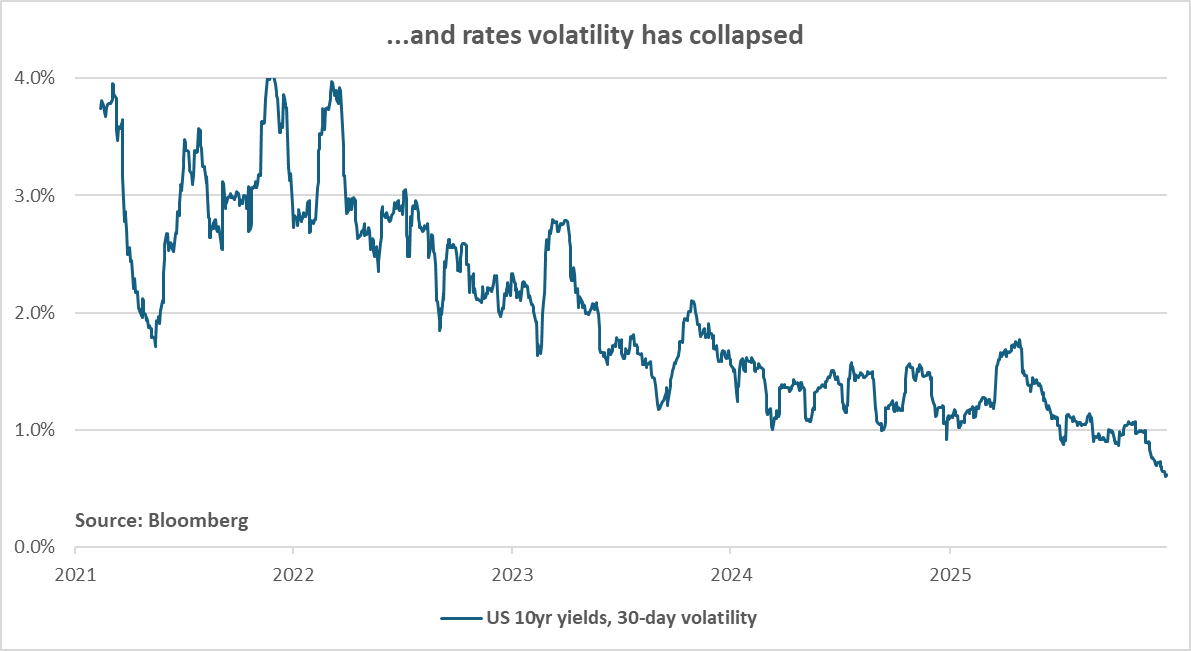 Rates volatility is compressing, aiding the equity rally despite higher yields