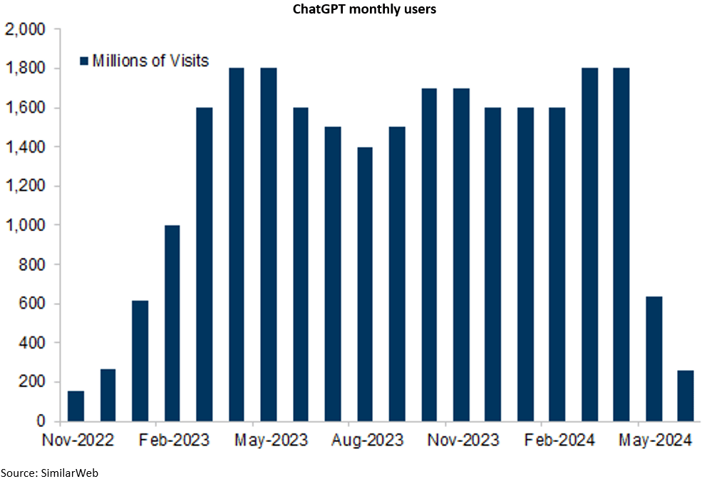 Investor beliefs: While ChatGPT monthly users have fallen, the soaring number of new AI patents keeps fueling investor hopes for ultimately massive profits. Reminder: dominant companies usually generate the vast majority of shareholder returns, and the potential prize for whoever wins this race could indeed be unprecedented.