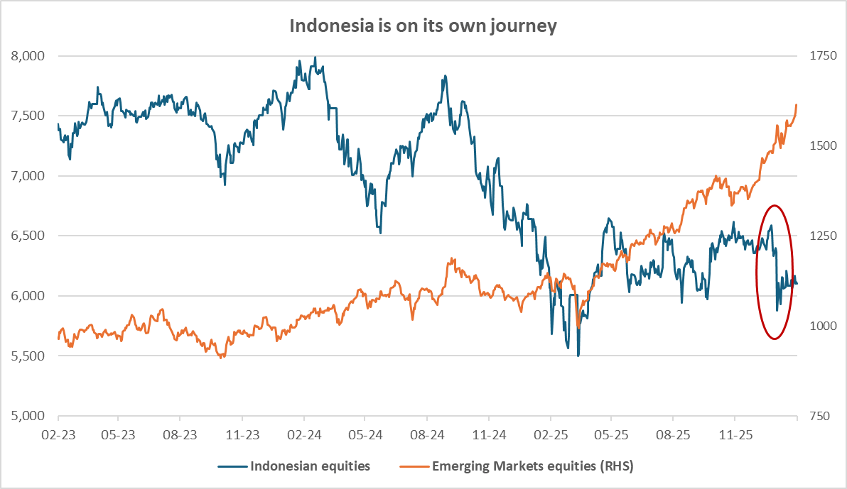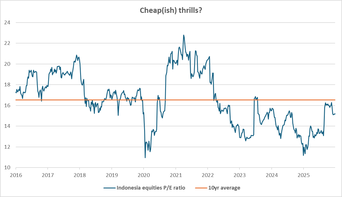 We have therefore opened a position in Indonesian equities given the attractive combination of ‘technical sell-off’ and ‘cheap enough to own while waiting for a re-rating’.