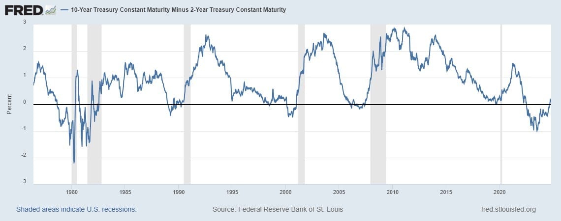 Adding to the fire, the spread between 10-year and 2-year US Treasuries – historically, a reliable indicator of an upcoming recession – went negative in summer 2022 and remained there for 2+ years, yet it recently came back above zero and the US economy is still going strong.